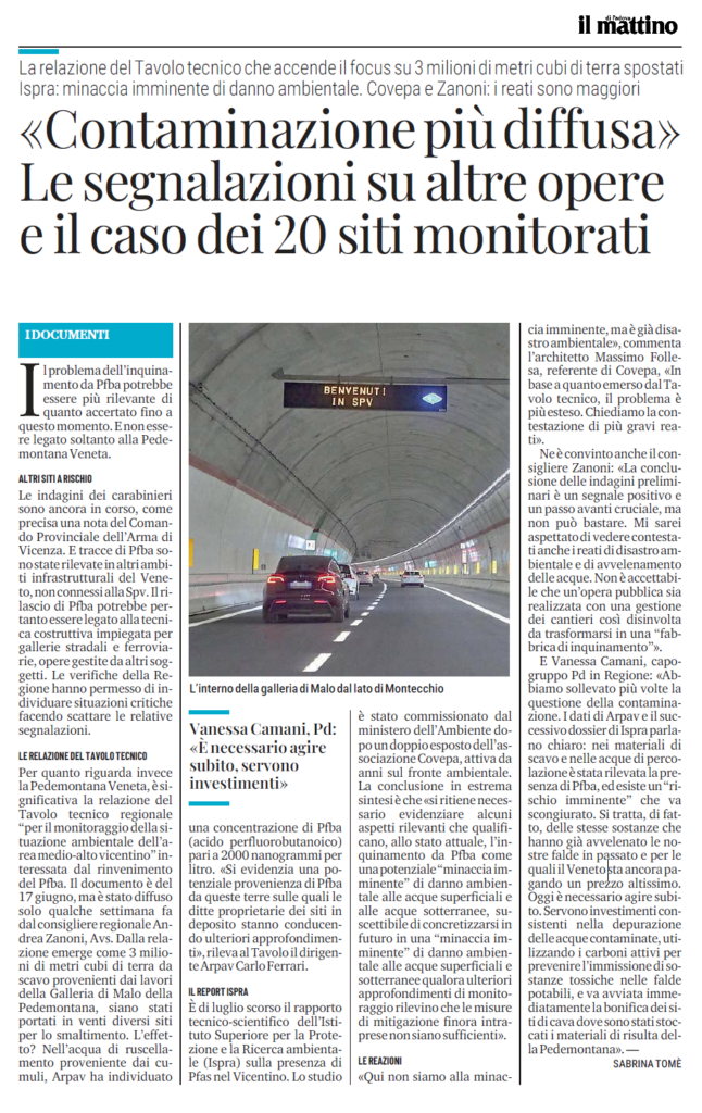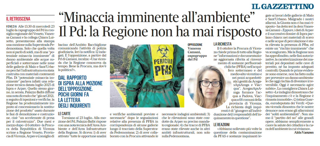 Con atti e interrogazioni in Consiglio regionale, tra tutti la mozione del 23 luglio proposta dal Gruppo PD abbiamo sollevato più volte la questione della contaminazione da PFAS e sostanze inquinanti legate ai lavori delle gallerie di Malo e Sant’Urbano. Malgrado i nostri allarmi, la Giunta non ci ha mai risposto. Eppure, i dati di Arpav e il successivo dossier di Ispra parlano chiaro: nei materiali di scavo e nelle acque di percolazione è stata rilevata la presenza di Pfba, ed esiste un “rischio imminente” che va scongiurato. Si tratta, di fatto, delle stesse sostanze che hanno già avvelenato le nostre falde in passato e per le quali il Veneto sta ancora pagando un prezzo altissimo.