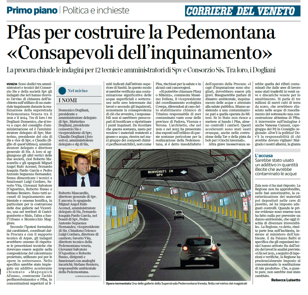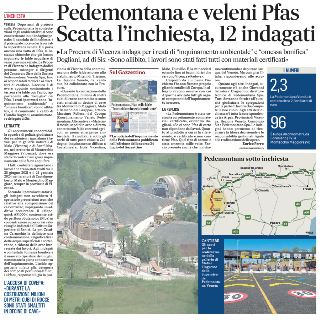 Chiediamo con tutta la nostra voce che la Regione Veneto protegga l’ambiente e la salute dei cittadini. Non è accettabile che la “reputazione” della Pedemontana quale opera pubblica fondamentale dell’era Zaia valga di più della necessità di tutelare la salute delle persone. Perché il prezzo di questa retorica rischiano di pagarlo i cittadini del Veneto, ancora una volta. Dopo la Miteni, il rischio è di rivivere la stessa storia: un disastro annunciato che si poteva – e si doveva – fermare.